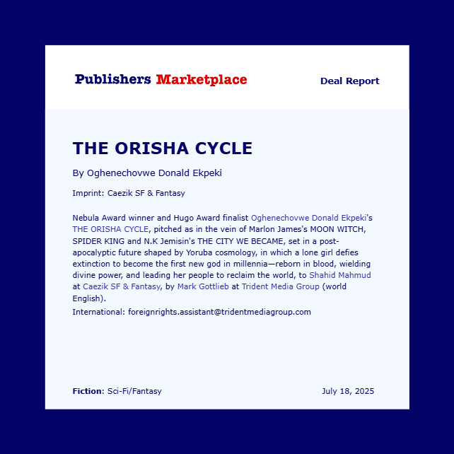 Oghenechovwe Ekpeki has had his debut novel Birth of Orisha acquired by Shahid Mahmud, the publisher of Caezik Books, an imprint of Arc Manor, with Lezli Robyn editing.